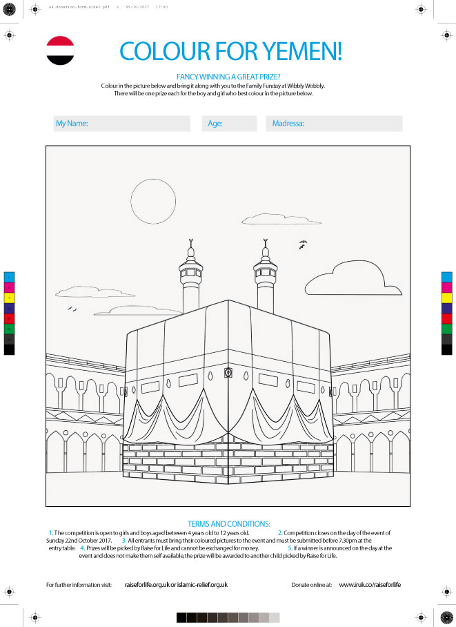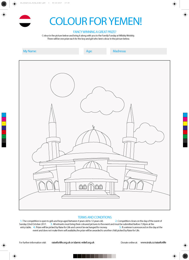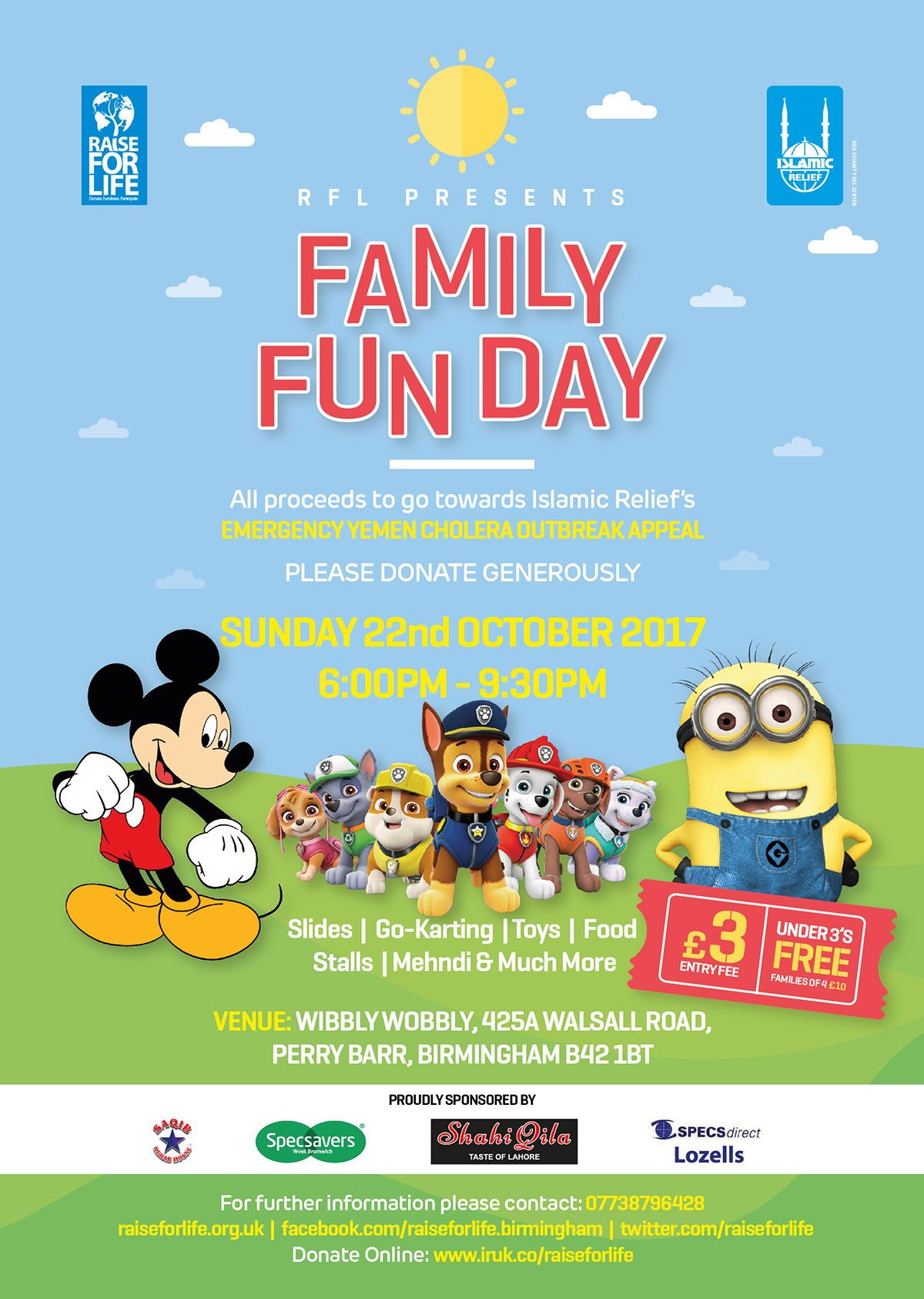 As you may be aware, ‘Raise for Life‘ has partnered with ‘Islamic Relief‘, hoping to raise awareness for their Yemen cholera appeal. To coincide with this initiative, we have arranged a family fun day, which will be held on the 22nd of October (between 6pm – 9.30pm) at Wibbly Wobbly – World of Play (425a Walsall Road, B42 1BT). We have also included a colouring competition for the children attending on the day. The art work will be distributed via local madrasahs or can be obtained via the link below. Prizes pertaining to this competition will be presented during the event In’Sha’Allah. If you would like to make enquiries regarding stalls, please contact us via the details provided on the poster. Ja’zakh’Allah.